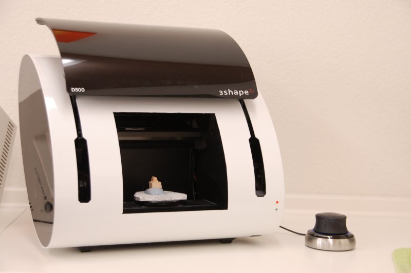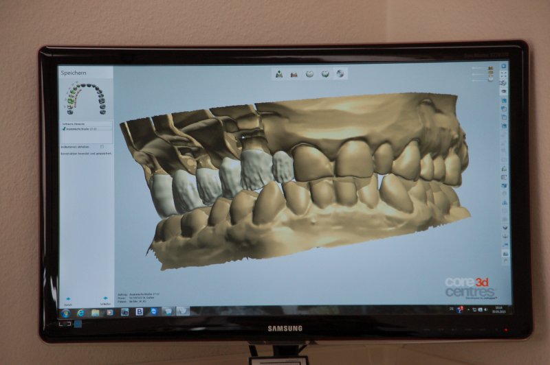 Es stehen eine Vielzahl ganz unterschiedlicher, industriell gefertigten und fräsbaren Materialien zur Verfügung. Das Modell wird mit meinem 3Shape Scanner digital eingescannt. Am Computer wird mit entsprechender Software das Gerüst der zahntechnischen Rekonstruktion konstruiert. Diese Daten werden in ein spezialisiertes Labor gesendet. Das dort präzise, stabile und biokompatible erstellte Gerüst, meist aus Zirkon, wird anschliessend von mir mit keramischen Massen zu einem natürlichen Zahn nachgebildet.